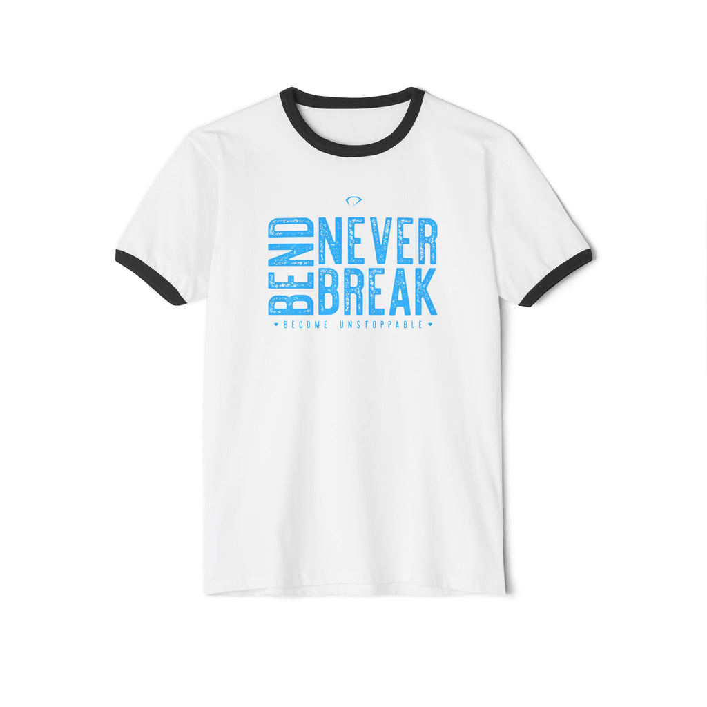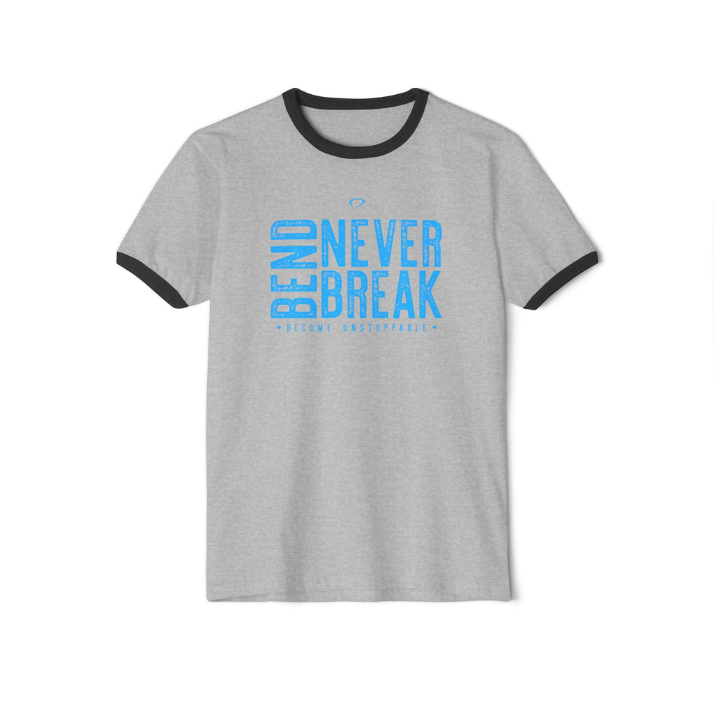 A soft, lightweight ringer tee with a bold, optimistic message: “Bend Never Break” printed in sky-blue across the chest. The gray body with contrasting black collar and sleeve rings gives a vintage-sport vibe that reads effortless and confident. Wear it on long walks, at weekend coffee shops, or layered under a jacket for casual nights out—this shirt moves with you, breathes, and keeps its shape while quietly declaring resilience.
