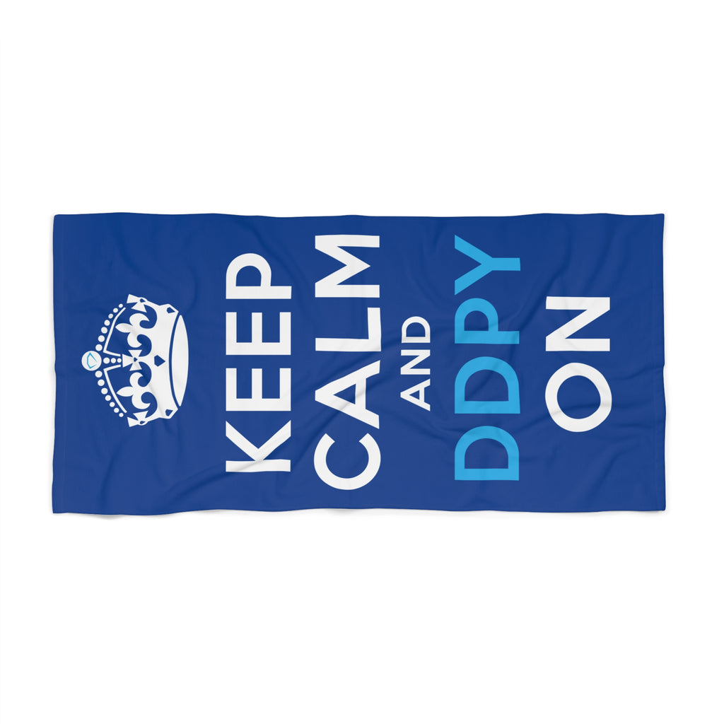 A bold, beach-ready towel that reads like a playful declaration: KEEP CALM AND DDPY ON. The deep navy background and crisp white crown icon give it a classic, slightly cheeky vibe, while the bright blue accent letters add a pop of modern color. Lightweight polyester on the printed side holds vibrant color and dries fast; the soft cotton loop backing gives a plush, absorbent touch against sun-warmed skin. Choose the roomy 36" × 72" for sprawling on sand or the 30" × 60" for compact beach bag days. It arrives hemmed and durable, designed for repeat summers and shoreline adventures.