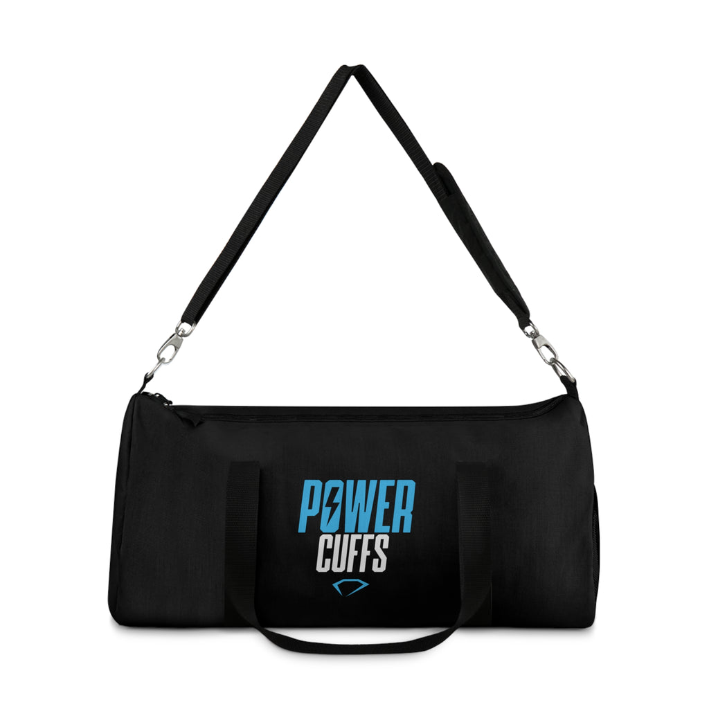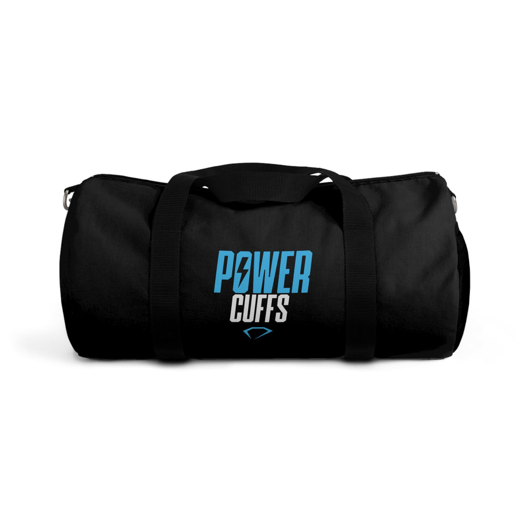 CUFFS” mark in cool blue pops against the black Oxford canvas, signaling intent without shouting. Inside, a roomy main compartment and a zippered internal pocket with a sewn-in name tag keep clothes and smaller gear organized. An exterior mesh side pocket gives quick access to a water bottle or sweaty towel. Carry it by the padded handles, sling it over your shoulder with the adjustable strap and brushed-nickel hardware, or detach the strap when you need a slimmer profile. Built from quick-drying 100% polyester Oxford canvas, it holds shape through workouts and travel, with sizes available to match light weekend loads or heavier training hauls. Assembled in the USA from globally sourced parts, it’s made for people who move hard and travel smart.