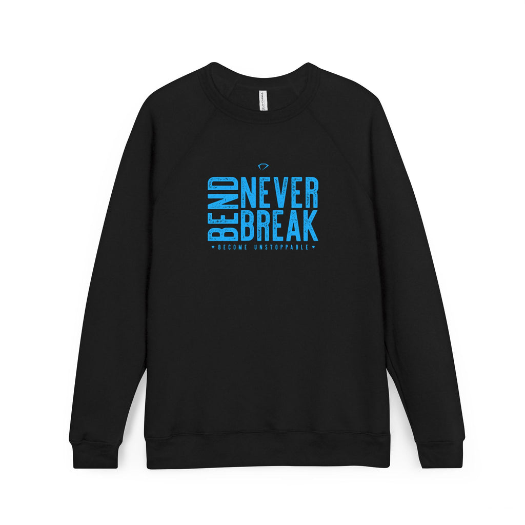 This crewneck sweatshirt carries a quiet confidence — soft, slightly structured, and built to move with you. The “BEND NEVER BREAK” graphic in bold blue sits centered on a deep black fleece, a simple statement for people who value steady resilience over flash. The raglan sleeves and side seams give it a relaxed silhouette that keeps its shape, while the medium-heavy 8 oz fabric feels substantial without being bulky. It’s the kind of layer you reach for on early mornings, long drives, or late-night projects — comfortable enough to wear around the house, sharp enough to wear out when you want to look grounded and composed. The tear-away tag and stretch ribbed cuffs make it easy to wear all day, every day.